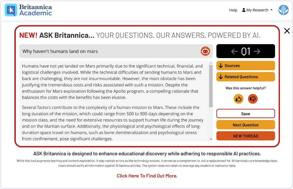 Ask natural-language questions and receive concise, reliable responses sourced only from Britannica’s content library.
