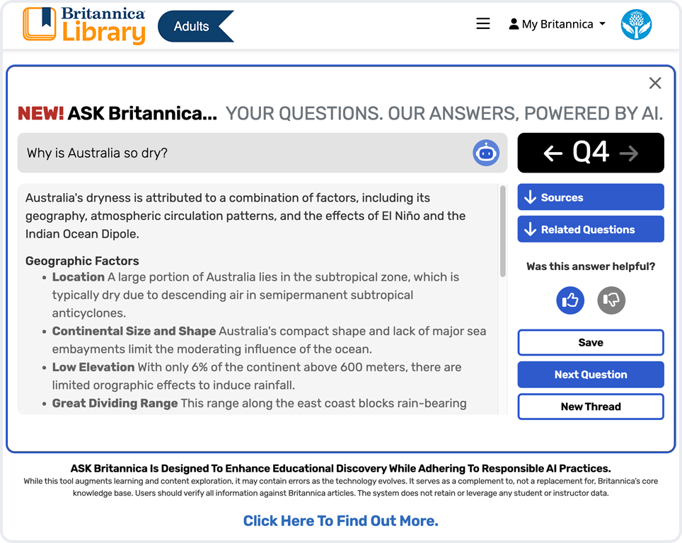 Every response links back to the original Britannica Library article(s), making it easy for patrons to verify information and expand their research.