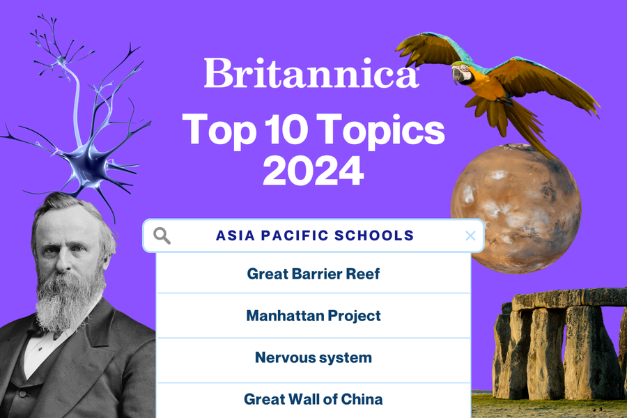 We processed millions of searches and visits from teachers and students across Australia, New Zealand and the Asia Pacific, to find your most burning questions from 2024. Click below to see the most read articles on Britannica School from the last year.
