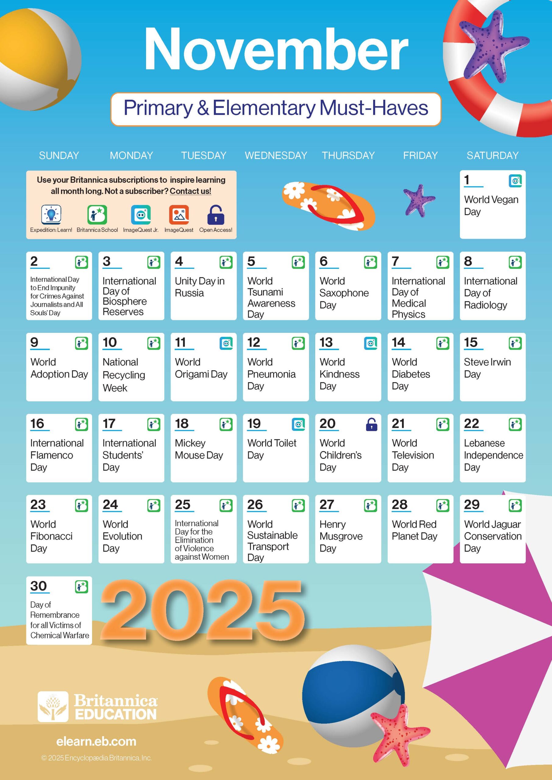 Download fileGet a daily dose of teaching inspiration with these monthly calendars. From World Vegan Day to World Children’s Day, tie your lessons to key dates marked in the calendar, to help students develop a closer awareness for the world around them. Each date comes with a related “must-have” resource from Britannica, hand-picked to help make your lesson planning a breeze.