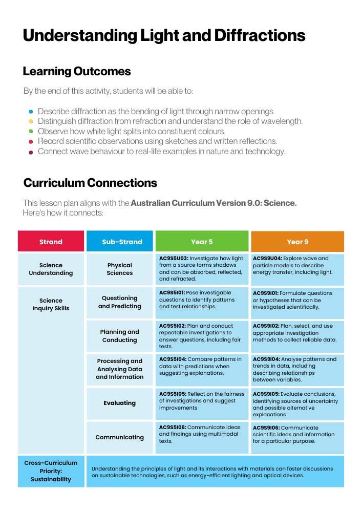 Identify sources of light, recognise that light travels in a straight path and describe how shadows are formed and light can be reflected and refracted (AC9S5U03).